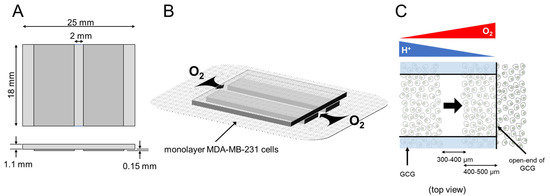 To establish metabolic gradients in monolayer cultured cells, we devised a glassware product, GCG [11] (Figure 8). When the GCG is placed on the monolayer cells in a culture dish, oxygen diffusion to the cells in the narrow channel is restricted to only via the two openings, as indicated by the arrows in Figure 8B. Cells in the narrow channel of the GCG consume oxygen. Thus, the balance between the rate of oxygen diffusion into the narrow channel and the rate of cellular respiration is predicted to establish a gradient of oxygen concentration where the oxygen concentration would gradually decrease from the opening of the GCG toward the center of the GCG. Similarly, the restriction of diffusional washout of metabolically produced CO2/H+ is predicted to establish gradients of extracellular pH, where pH would be higher at the openings (Figure 8C).