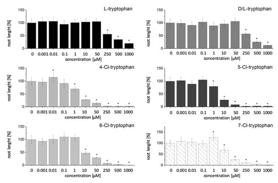 In previous studies with L-tryptophan, hormone-like effects, either through the compound itself or with conversion to IAA, could be demonstrated for root growth by adding different Trp concentrations to Lactuca sativa, cotton and maize. At lower concentrations, the growth of the roots increased, while higher concentrations inhibited the growth of the roots [,,]. In our investigations with L-Trp, we could only transiently verify these hormone-like effects on the root growth of A. thaliana. At higher concentrations we also found that the growth of the roots was inhibited (Figure 1). Additionally, we investigated the root growth of A. thaliana with different chlorinated Trp derivatives, which has not been reported so far. However, these experiments show that there are no highly significant growth increases. For all Cl-Trp compounds it was observed that the inhibition of the root growth starts at a much lower concentration than after the addition of Trp. These results are first indications that the chlorinated compounds have a significantly higher bioactivity compared to the non-chlorinated compounds. Whether the described effects are due to the effect of the substance itself or whether a conversion of Trp into other metabolites such as IAA leads to these effects cannot be conclusively clarified. In future work, auxin biosynthesis mutants should be used to answer this question.
