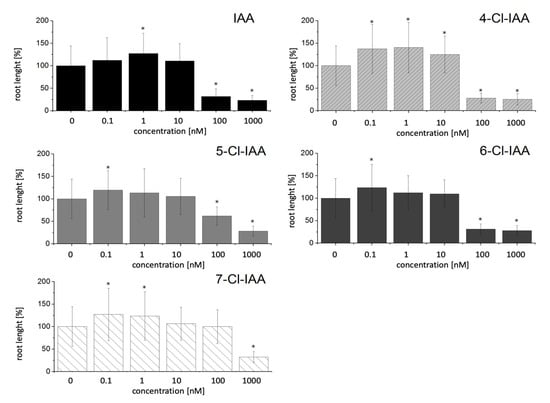 Effect of indole-3-acetic acid (IAA) and Cl-IAA on root length of A. thaliana wild type plants. Concentrations are given in nM. Shown are the relative root lengths 17 days after incubation on different IAA- and Cl-IAA-containing media. The results are calculated based on the control plants without any treatment to make them more comparable between different experiments. Significant differences of p < 0.05 in comparison to the control plants are labeled with *. Data are mean values of N > 50 ± SD.