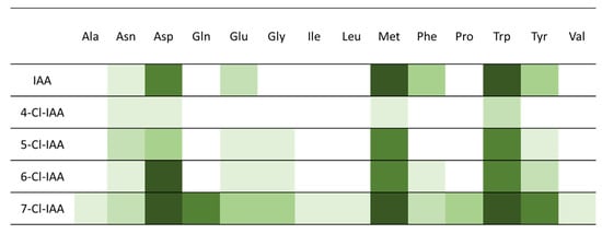 In vitro production of chlorinated IAA amino acid conjugates. Shown are the different produced chlorinated IAA conjugates with AtGH3.3 and different chlorinated IAAs as substrates in an in vitro experiment. Darker green colors = conjugates which are produced in higher amounts; lighter green colors = lower amounts are produced (based on the intensity of the spots of the thin layer chromatography (TLC) plates, Figure S2, and IAA estimates are based on []). Ala = alanine, Asn = asparagine, Asp, aspartate, Gln = glutamine, Glu = glutamate, Gly = glycine, Ile = isoleucine, Leu = leucine, Met = methionine, Phe = phenylalanine, Pro = proline, Trp = tryptophan, Tyr = tyrosine, Val = valine.