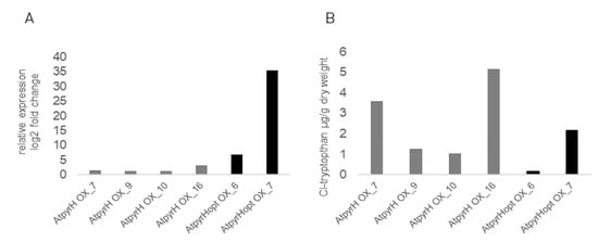 Second, we analyze the differences between the transgenic lines and wild type after the treatments. In general, there was no consistent up- or downregulation of any transcripts in the transgenic lines in comparison to the wild type. Thus, the induction/repression of genes in individual transgenic lines seems to be line specific. Nevertheless, there are some interesting observations possible. Both CYP genes are downregulated in line AtpyrHOX_16 after all Trp treatments (CYP79B3) or only after treatment with 5-Cl-Trp (CYP79B2), while NIT2 expression was mainly upregulated in this line after treatments with Trp and Cl-Trp. However, the second line harboring a non-optimized construct showed a different pattern, namely upregulation of CYP79B2 and NIT2 by high concentrations of Cl-Trp, but CYP79B3 and NIT1 were either not regulated at all or, in one case, downregulated. In line AtpyrHopt OX_6 there was an upregulation of CYP79B2 for one and CYP79B3 for all Cl-Trp treatments, while only NIT2 expression was upregulated by both Trp derivatives at high concentrations. In conclusion, upregulation of NIT transcription in some lines, including wild type, by Trp and Cl-Trp (at different concentrations) could indicate a role for this enzyme in the conversion of high levels of precursor and also, together with the CYP79B2/B3 genes, in stress response (see Section 3.3.)