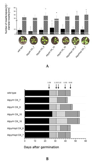 A: Numbers of rosette leaves (black histograms) and diameter of the rosettes (grey histograms) of different transgenic A. thaliana lines harboring bacterial pyrH in comparison to wild type plants after ca 30 days after germination. Significant differences of p < 0.05 in comparison to wild type are labeled with *. Data are mean values of N > 30 ± SD. B: Phenotypical analysis according to Boyes et al. []. Indicated are the developmental stages of 8 leaves (1.08), 10 leaves (1.10), bud (inflorescence) formation (5.10), flowering (6.00) and pod formation (8.00). The details of the developmental stages are defined in []. The days after germination where plants were entering the respective developmental time point are marked by arrows on top of the plot. The respective category was reached when 66% of the examined plants had the same growth characteristic. N > 30. The x-axis (A) and y-axis (B) describe the individual line names as given in the Materials and Methods Section and are the same as in Figure 4. The data for the two other halogenase expressing lines, AtthdH and AtprnA, are shown in the supplement (Figure S4).