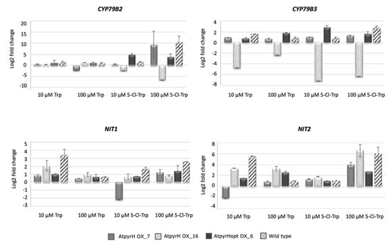 Expression analysis of different transgenic Arabidopsis thaliana lines harboring the 5-Cl-Trp halogenase gene pyrH and wild type after feeding of Trp and 5-Cl-Trp in different concentrations. Normalization was done to the untreated plants of the respective lines. A fold change higher than 2 in the logarithmic scale means an up-regulation of the respective gene and a fold-change under 2 a down-regulation. CYP79B2, B3 = cytochrome P450 involved in the synthesis of indole-3-acetaldoxime; NIT1, 2 = nitrilase. The individual line names are as given in the Materials and Methods Section.