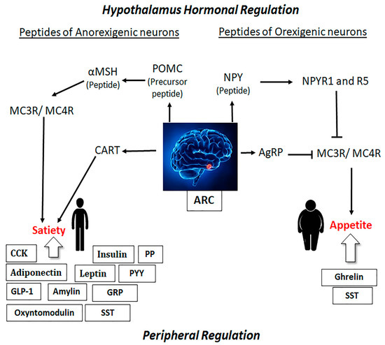 Most neuroendocrine signals and functions displayed by central and peripheral stimuli in regulation and maintenance of appetite are confined in different regions of the hypothalamus. Amongst them ARC is the hypothalamic nuclei that maintains the balance between food intake and energy requirement [15]. ARC remains vulnerable to endocrine signals coming from the rest of the body due to the fenestrated capillaries and close proximity to median eminence [79]. ARC is composed of different types of neurons that respond to endocrine signals and produce impulses for the regulation of obesity and satiety. In the hypothalamus, two major types of neurons including anorexigenic and orexigenic are confined in different nuclei, including ARC, PVN, and LHA. Previous studies have shown that anorexigenic neurons of ARC coexpressed two important peptides, which reduce hunger and produce satiety [16,69,80,81]. The first peptide is POMC, a precursor peptide which is cleaved by propeptide convertases 1 and 2 at lysine and arginine residues. Furthermore, POMC is involved in the formation of many active neuropeptides like α-MSH, which binds to melanocortin 3 (MC3R) or melanocortin 4 receptor (MC4R) and leads to satiety [82]. Thus, the lack of POMC binding at MC4R or mutations in propeptide convertases 1 can lead to early-onset of obesity [16,69,79,80,81]. The second peptide is CART that produces anorexic effects [83]. Furthermore, two other peptides, namely NPY and AgRP coexpressed in orexigenic neurons of ARC, and associated with increased appetite. NPY binds to different neuropeptide Y receptor 1–6 (NPYR1–6) member of GPCR family [80]. However, the binding of NPY to NPYR1 and NPYR5 act as an antagonist on MC3R and MC4R receptors, respectively, thereby increasing appetite and leading to obesity [84], as described in Figure 1. Similar to NPY, AgRP also stimulates food intake [16,69].