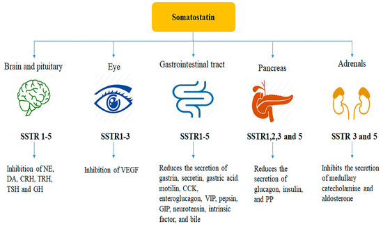 Soon after the discovery of SST-14 and SST-28 and widespread distribution in different body parts, five different receptor subtypes, namely SST receptors 1–5, were identified, which are encoded by five different genes and exhibit 70% structural similarity between human and rodents. SSTR subtypes belong to a family of GPCRs and all five SSTR subtypes have been pharmacologically characterized [150]. In addition, to display the classical features of GPCRs, SSTRs also contain postsynaptic density protein, disc large, and zona occludens-1 (PDZ) domain, and many other interacting proteins have also been identified in a receptor-specific manner [2,151]. Both SST-14 and SST-28 have shown a high affinity towards human SST receptor subtypes 1–4. However, the binding affinity of SST-28 towards SSTR5 was found to be 5–10 times more than for SST-14 [2,150]. Several synthetic analogues have been developed with improved half-life and better efficiency and effectiveness. Such long-acting analogues were primarily formulated for the treatment of tumours of different origin including GIT, pancreas, gut, and pituitary [152,153]. All five SSTR subtypes are widely distributed throughout the CNS in a receptor and brain region-specific manner. In the pancreas and pituitary, SSTR1–5 are well expressed and exhibited receptor-specific coexpression with hormone-producing cells [154]. In addition, SSTR subtypes are also expressed in peripheral tissues. The expression of SSTRs in cancer tissues has drawn significant attention towards cancer treatment as a potential therapeutic target. SSTR subtypes have also been detected at the level of mRNA and protein in GIT in a species and receptor-specific manner. SSTR2 and SSTR5 are the predominant subtypes in endocrine tissues [155,156,157].