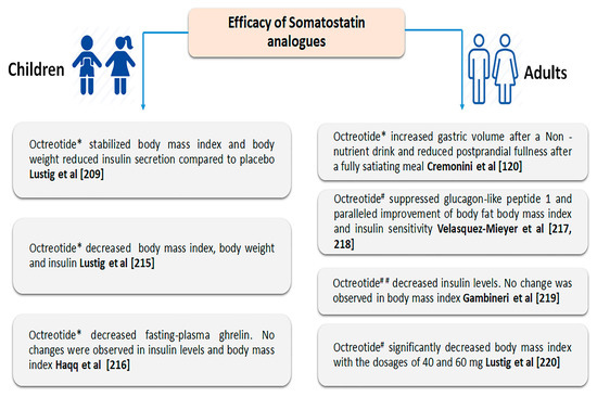 The hedonic eating behaviour of palatable food that is regulated by several cortical brain regions is a crucial contributor in obesity and satiety in a region-specific and neuronal phenotype manner. Whether SST plays any role in this direction is not well understood. Recently, Zhu et al. demonstrated that basal forebrain regions rich with GABAergic neurons play a key role in food intake [212]. This study also stated that the activation of the basal forebrain SST positive neurons selectively showed a preference for high-calorie food intake (high-fat chow and high sucrose water) within minutes with no effect on normal food. Furthermore, the projections from SST expressing neurons to the LHA induced high-fat intake without inducing preference for high sucrose. These observations also emphasized the increased fat and sucrose intake following optogenetic activation of SST neurons in basal forebrain and with anxiety-like behaviour in mice [212]. A recent study identified a subset of SST positive neuronal cells in ARC co-expressing AgRP, and the activation of these neurons was sufficient to drive feeding behaviour, although not selectively for fat, which suggests that different SSTR subtypes might be responsible for different feeding behaviours [213]. The safety and efficacy of SST and its analogues were evaluated in various clinical trials involving obese children and adults [13,120,209,214,215,216,217,218,219,220] (Figure 3).