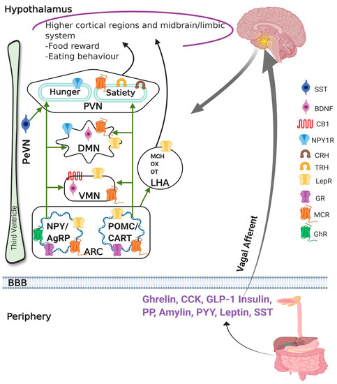 The distribution of neuronal cells in the different hypothalamic regions with selective and preferential expression of hormonal peptides with orexigenic and anorexigenic stimuli attested the hypothalamus as a key centre in the regulation of appetite and energy homeostasis [68]. Previous studies with disrupted different hypothalamic regions implicate the importance and significance of the hypothalamus in food intake and satiety [69]. In the hypothalamus, ARC is composed of orexigenic neurons producing neuropeptide Y (NPY) and agouti-related peptide (AgRP) and anorexigenic neurons, which synthesize proopiomelanocortin (POMC) and cocaine- and amphetamine-regulated transcript (CART). ARC is not fully protected by the blood–brain barrier (BBB) and is believed to integrate most peripheral signals of leptin, insulin, and ghrelin as well as nutrients via systemic circulation and implicated in food-seeking behaviour. Orexigenic and anorexigenic neurons confined in ARC also project to other hypothalamic regions including VMN, PVN, and LHA, as well as to the brain stem and spinal cord [70,71]. The key regulators of catabolic response, including corticotropin-releasing hormone (CRH), thyrotropin-releasing hormone, vasopressin, and orexin (OX), are synthesized and released from neuronal cells present in PVN and exert an inhibitory role on food intake and weight gain [72]. Animals with disrupted VMN are prone to eat excess food that causes hyperphagia, hyperglycemia, and obesity, proposing that VMN is primarily involved in satiety and glucose homeostasis. VMN receives neuronal input from ARC and sends projection to ARC. In particular, VMN additionally contains neurons that produce brain-derived neurotrophic factor (BDNF) that is associated with anorexigenic behaviour [73]. Several interconnected pathways between LHA and other CNS regions suggest that LHA serves as a key centre in the regulation of feeding behaviour [66,74,75]. Furthermore, the lesion of LHA prompts anorexia and weight loss [65,76]. Dorsomedial nucleus (DMN) received NPY and melanocyte stimulating hormone (MSH) input from ARC and damage to DMN are associated with hyperphagia and obesity. LHA also contains melanin-concentrating hormone and OX producing neurons and disruption resulted in hypophagia and weight loss. DMN and LHA are believed to have neuronal cells which sense leptin and glucose [77,78]. Recent studies have added new information regarding the expression of several other neurotransmitters and peptides and their coexpression with NPY/AgRP and POMC in different regions of hypothalamus.