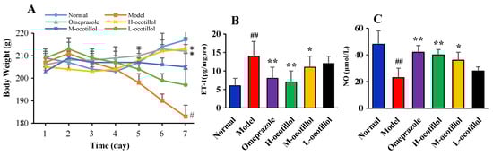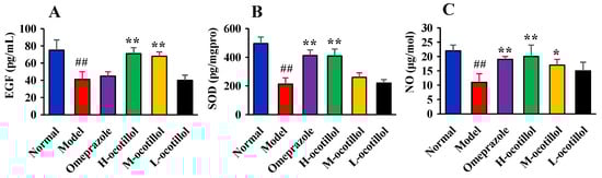 2.1.3. Epidermal Growth Factor(EGF), Superoxide Dismutase (SOD), and NO Levels in Gastric Mucosa