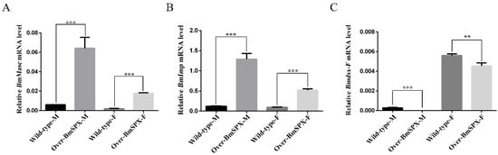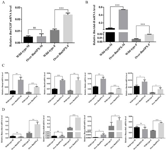 2.2. Over-Expression of BmSPX Influences Expression Level of Key Genes in Sex Determination Pathway