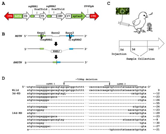 Preparation and validation of MSTN knockout (KO) muscles. (A) Schematic of the AdV-CRISPR system used in this study. (B) Strategy for large fragment deletion of the chick locus by non-homologous end joining (NHEJ). (C) Mode of AdV-CRISPR system delivery and experimental design. (D) Sequencing of the RT-PCR product from muscles injected with the AdV-CRISPR system.