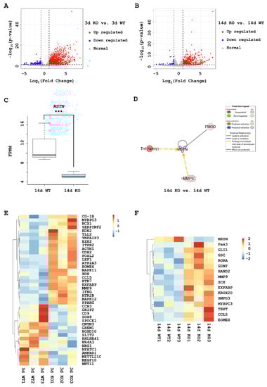 Differentially expressed genes (DEGs) from RNA-Seq data. (A) Volcano plot reveals significant differentially expressed genes in the 3d KO vs. 3d wild-type (WT) groups. (B) Volcano plot of significant differentially expressed genes of the 14d KO vs. 14d WT groups. *** p-value < 0.001. (C) The expression of MSTN in the 14d KO and 14d WT groups. (D) DEGs associated with MSTN in the 14d KO vs. 14d WT groups. (E) Heatmap hierarchical clustering revealed the DEGs related to skeletal muscle tissue development in 3d KO vs. 3d WT groups. (F) Heatmap hierarchical clustering revealed the DEGs related to skeletal muscle tissue development in the 14d KO vs. 14d WT. This result also has some limitations, because the KO groups were injected with AdV-CRISPR, while the WT groups were injected with phosphate buffered saline (PBS).
