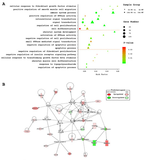 Representative enriched gene ontology functional classifications and associated network of differential expression genes (DEGs) between MSTN knockout (KO) and wild-type (WT) muscles. (A) Representative gene ontology (GO) enrichment terms of DEGs in the 3d KO vs. 3d WT groups and 14d KO vs. 14d WT groups. (B) Gene network containing DEGs related to Neurological Disease, Organismal Injury and Abnormalities, and Skeletal and Muscular Disorders. This result also has some limitations, because the KO groups were injected with AdV-CRISPR, while the WT groups were injected with PBS.