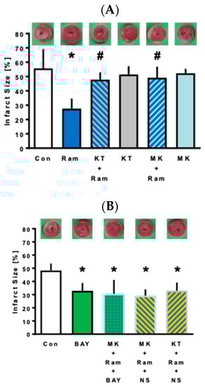 - KT5823+Ram+NS1619 (MK+Ram+NS): Hearts were perfused with Ramelteon (0.03 µM) in combination with the PKG inhibitor KT5823 (1 µM) and the mKCa-channel activator NS1619 (10 µM) for 10 min.