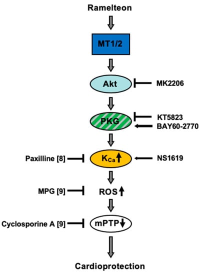 Torregroza, C.; Jalajel, O.; Raupach, A.; Feige, K.; Bunte, S.; Heinen, A.; Mathes, A.; Hollmann, M.W.; Huhn, R.; Stroethoff, M. Activation of PKG and Akt Is Required for Cardioprotection by Ramelteon-Induced Preconditioning and Is Located Upstream of mKCa-Channels. Int. J. Mol. Sci. 2020, 21, 2585. https://doi.org/10.3390/ijms21072585