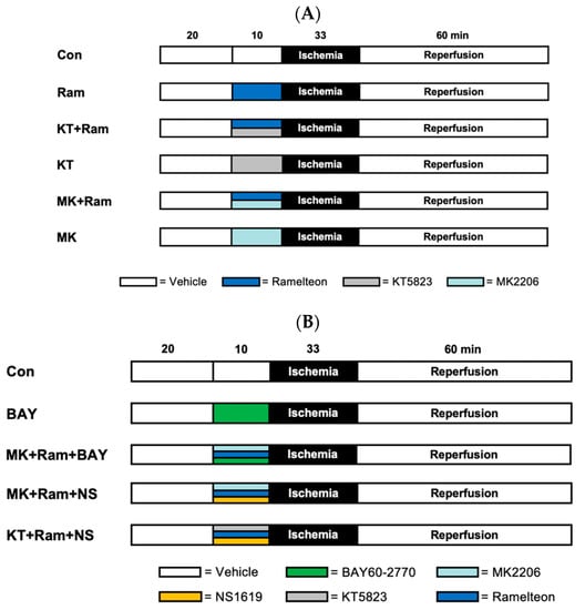- MK2206+Ram+BAY60-2770 (MK+Ram+BAY): Hearts were perfused with Ramelteon (0.03 µM) in combination with the Akt inhibitor MK2206 (15 nM) and the sGC activator BAY60-2770 (5 nM) for 10 min.