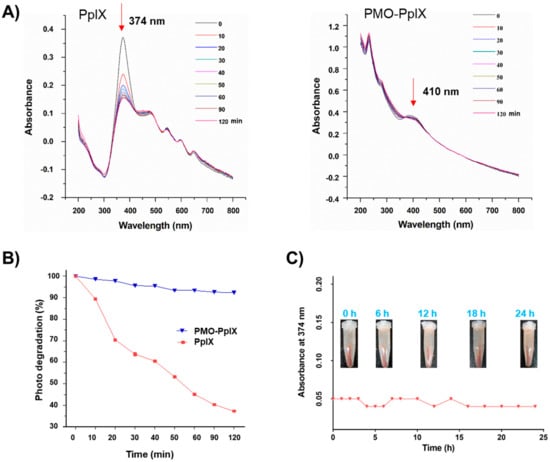 Indeed, it should be noted that the photosensitizer stability is improved, when immobilized in an appropriate nanocarrier. The effect of light on the stability of the photosensitizer was tested by irradiating the specific light for a given period, and the method is as follows. PMO-PpIX nanoconjugates (10 mg) and equivalent molar concentration of free PpIX were uniformly dispersed in 1.0 mL of dd-H2O, and the samples were illuminated with green laser light (532 nm). During the study under long-term laser irradiation, the sample was placed in 4 °C, so that the samples could be cooled down to reduce the thermal effects. The changes in the absorption intensity of PpIX were recorded using the UV-vis spectrophotometer every 10 min for 120 min [].