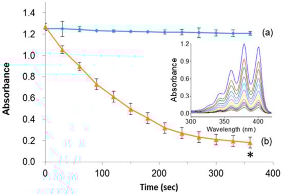 Photo-induced singlet oxygen detection. (a) 10-anthracenediyl-bis(methylene)dimalonic acid (ABMDMA) alone, and (b) ABMDMA in combination with PMO-PpIX. Inset figure showing the absorption spectra of (b) scanned at UV-vis wavelength range every 30 s. (* p < 0.001).