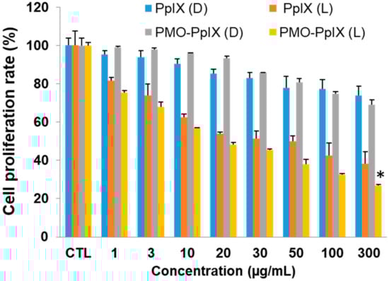 During PDT, the photosensitizers actively produce immense levels of toxic reactive oxygen species (ROS) (in this case, singlet oxygen by PpIX) under light irradiation, which, more often obstruct the cell metabolic activities, such as mitochondrial dysfunction and nucleus deterioration, among others. To evaluate the PDT effects of our design, we initially performed the cell proliferation studies in vitro of free PpIX and PMO-PpIX samples at various concentrations (viz. 0–300 µg/mL) in the presence and absence of light irradiation using MTT assay in the HT-29 cell line. Figure 5 depicts the MTT assay results that depict the cellular metabolic activity, a critical indicator of cell proliferation rate. The designed PMO-PpIX nanoconjugates exhibited dose-dependent cytotoxicity HT-29 cells in the light-irradiated treatments, which could be attributed to the photochemical reaction process and provoked the ROS generation by PpIX molecules in the presence of light. The bioefficacy of PMO-PpIX treatment was proportionally higher than that of the PpIX treatment at a similar concentration, attributing to the photostability of the PpIX in the post-modified PMO nanospaces.