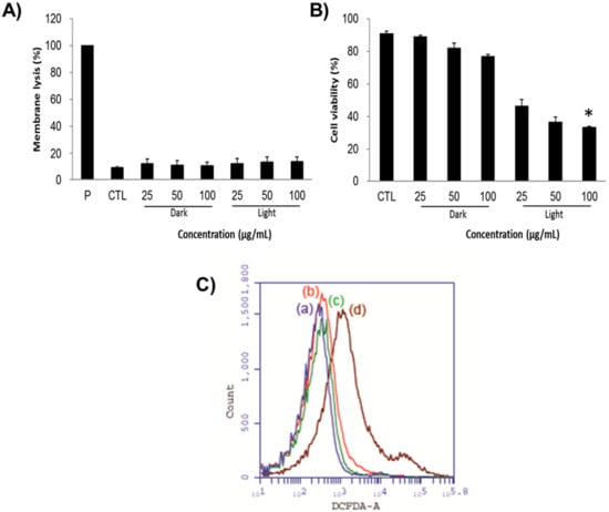 (A) Lactate dehydrogenase (LDH) levels representing the cell membrane lysis rate after treating the HT-29 cells with various concentrations of PMO-PpIX (25, 50, and 100 µg/mL) in both dark and light conditions provided. Triton X-100 is used as a positive control (P), which refers to the total amount of LDH in cells. Control treatment (CTL) relates to the amount of LDH released from cells without any treatment. (B) Respective cell viability rates during the LDH assay. (* p < 0.001). (C) The ROS determination using the 2′,7′-dichlorofluorescein diacetate (DCFDA) assay by flow cytometry in various treatments of (a) the control treatment group in the absence of light, (b) the PMO treatment group in the presence of light, (c) the PMO-PpIX treatment in the absence of light, and (d) the PMO-PpIX in the presence of light.
