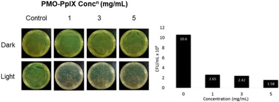 Anti-microbial PDT effect of PMO-PpIX. E. coli strain treated with various concentrations of PMO-PpIX in the absence (D) and presence (L) of green light. Graph showing the colony-forming units (CFUs) count concerning the concentration of PMO-PpIX in the presence of light.