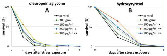 2.1. Oleuropein Aglycone and Hydroxytyrosol Extended the Survival of Wild-type C. elegans after Heat Stress