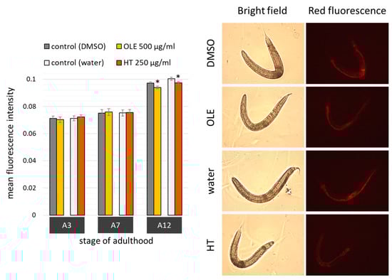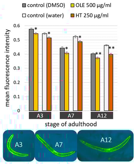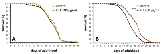 - Cañuelo, A.; Gilbert-López, B.; Pacheco-Liñán, P.; Martínez-Lara, E.; Siles, E.; Miranda-Vizuete, A. Tyrosol, a main phenol present in extra virgin olive oil, increases lifespan and stress resistance in Caenorhabditis elegans. Mech. Ageing Dev. 2012, 133, 563–574. [Google Scholar] [CrossRef]