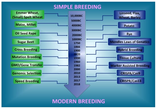 Plant breeding can be used to develop plants with desired traits []. Artificial plant selection has been used by humans for the past 10,000 years, selecting and breeding plants with higher nutritional values [] (Figure 1). Traditional agricultural methods aimed to improve the nutritional status of different food plants. Recent scientific developments provide a wide range of possibilities and innovations in plant breeding []. To satisfy the continuously increasing demand for plant-based products, the current level of annual yield enhancement in major crop species (varying from 0.8–1.2%) must be doubled [].