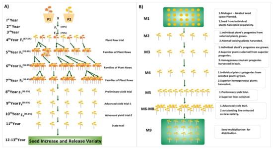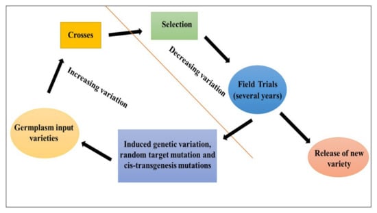 A trait (e.g., stress tolerance) can be improved by selecting the best hybrid progeny with the desired trait using cross breeding [] (Figure 2a). Desired traits can also be introduced into a chosen ‘best’ recipient line through backcrossing of the selected progeny with the recipient line for several generations to reduce unwanted phenotype combinations []. Genetic variability can be reduced by the use of long-term traditional breeding methods; thus, the introduction of new genes is required for the improvement of desired traits by speed breeding, mutation breeding, and rapid generation advance (RGA) [,,]. From this point of view, mutations could be useful in plant breeding programs and all these precision breeding tools can contribute to the improvement of specific features during the breeding cycle. Plant breeding is always approached holistically by analyzing all applicable agricultural functionality (Figure 3).