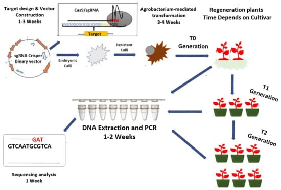 Yin et al. (2017) found that Cas9 can be ‘tricked’ by supplementing any foreign nucleotide sequence that is digested and inserted in the bacterial genome. To knock a gene out, the CRISPR/Cas9 system is designed accordingly and transformed to explants via Agrobacterium, electroporation or the biolistic method. The regenerated plantlets’ grown from the transformed callus are then transferred to planting soil []. The CRISPR/Cas9 gene knockout system has four significant features: (a) synthetic guide RNA (about 18–20 nucleotides) binding to target DNA, (b) Cas9 cleavage at 3–4 nucleotides after the adjacent proto spacer motif (PAM) (generally, 50 NGG identifies the PAM sequence) [], (c) selection of a suitable binary vector and sgRNA cloning, and (d) transforming the construct in explants via Agrobacterium or microprojectile gene bombardment (Figure 4). Agrobacterium-mediated transformation is preferred in most studies given its efficiency and secure delivery []. The transformants are raised in growth chambers and examined for mutation studies using PCR, western blotting, ELISA, genotyping, sequencing, and other molecular techniques.