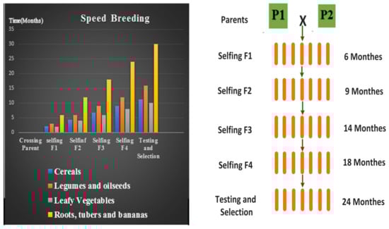 Until recently, speed breeding had been reported to shorten generation time by extending photoperiods (Figure 5), while certain crop species, such as radish (Raphanus sativus), pepper (Capsicum annum), and leafy vegetables such as Amaranth (Amaranthus spp.) and sunflower (Helianthus annuus) responded positively to increased day length [,,,]. Speed breeding of short-day crops has been limited because of their flowering requirements. Nevertheless, recently, Lee Hickey and his research team worked on developing protocols for short-day crop like sorghum, millet and pigeon pea with the International Crop Research Institute for the Semi-Arid Tropics (ICRISAT) as part of a project funded by the Bill and Melinda Gates Foundation (https://geneticliteracyproject.org/2020/03/02/how-speed-breeding-will-help-us-expand-crop-diversity-to-feed-10-billion-people/). Sorghum, millet, and pigeon peas are important plants for many smallholder farmers in Africa and Asia, refining protocols targeted for these types of users has significant implications for global subsistence agriculture. This goal involves improving the protocols and conditions required for the induction of early flowering and rapid crop development []. O’Connor et al. (2014) already reported successful results in the speed breeding of peanuts (Arachis hypogaea). Increased day length helped amaranth (Amaranthus spp.) to achieve more generations annually []. In staple food crops requiring shorter photoperiods to initiate the reproductive phases, such as rice (Oryza sativa) and maize (Zea mays), speed breeding can accelerate vegetative growth []. Using speed breeding, it is possible to develop successive generations of improved crops for field examination via SSD, which is cheaper compared to the production of DHs. Speed breeding is also favorable to gene insertion (common haplotypes) of distinct phenotypes followed by MAS of elite hybrid lines [,].