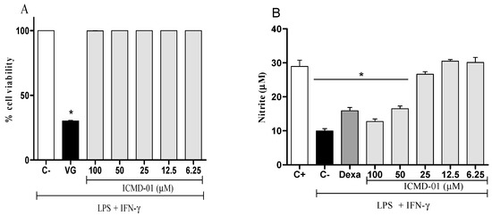 Cytotoxic effect of ICMD-01 (A) and its modulation of nitric oxide production on macrophages (B). Panel (A): J774 cells were incubated with vehicle (5% DMSO in saline, control group) or different concentrations of ICMD-01 (ICMD-01; 6.25, 12.5, 25, 50 or 100 μM) for 72 h, and cell viability was determined by Alamar Blue assay. Gentian violet (GV) was used as the positive control. Data are expressed as means ± SEMs; n = 4 determinations per group. * Significantly different from the vehicle treated cultures (p < 0.05). ANOVA followed by Tukey’s multiple comparison test. Panel (B): Concentrations of nitrite were determined in J774 macrophages treated with vehicle (5% DMSO in saline, control group), IMCD-01 (ICMD-01; 6.25, 12.5, 25, 50 or 100 μM) or dexamethasone (Dexa; 40 μM) in the presence of LPS (500 ng/mL) plus IFN-γ (5 ng/mL). Cell-free supernatants were collected 24 h after treatments for nitrite quantification by the Griess method. Ct- shows concentrations of nitrite in unstimulated cells. Data are expressed as means ± SEMs; n = 6 determinations per group. * Significantly different from the vehicle treated cultures stimulated with LPS + IFN-γ (p < 0.05). ANOVA followed by Tukey´s multiple comparison test.