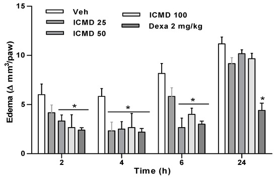 The effect of ICMD-01 on complete Freund’s adjuvant (CFA)-induced paw inflammation. Mice were injected with ICMD-01 (25, 50 and 100 mg kg−1), vehicle (5% DMSO in saline; control group) orally or dexamethasone (intraperitoneal route) (Dexa; 2 mg kg−1; reference drug) 40 min before CFA (injected at time zero). Paw edema was measured 2, 4, 6 and 24 h after CFA, represented as paw volume variation. Data are expressed as means ± SEMs; n = 6 mice per group. * Significantly different from the control group (p < 0.05). Two-way ANOVA followed by the Bonferroni’s test.