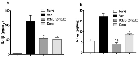 The effect of ICMD-01 on cytokine paw levels during CFA-induced inflammation. Mice were injected with ICMD-01 (50 mg kg−1), vehicle p.o. (5% DMSO in saline; control group) orally, or dexamethasone (intraperitoneal route) (Dexa; 2 mg kg−1; reference drug) route 40 min before CFA (injected at time zero). The naïve group consisted of mice that did not receive any experimental manipulation. Panels shows the paw levels of (A) interleukin-1β (IL-1β); (B) tumor necrosis factor-α (TNF-α), determined in skin tissues samples by ELISA, 3 h after the CFA injection. The results are expressed as picograms of cytokine per milligram of protein. Data are expressed as means ± SEMs; n = 6 mice per group. * Significantly different from the vehicle group in the same time (p < 0.05); # significantly different from the naive group (p < 0.05). ANOVA followed by Tukey´s multiple comparison test.