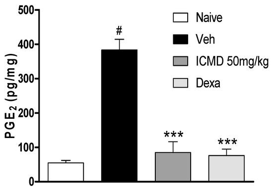 To validate the anti-inflammatory profile, the modulating potential of ICMD-01 (50 mg kg−1, PO) against the production of pro-inflammatory cytokines and prostaglandin E2 (PGE2) was measured in vivo. Cytokines are a diverse group of mediators widely released during inflammation. The compound ICMD-01 showed statistically significant inhibition (p < 0.05) of IL-1β and TNF-α local levels (Figure 6A,B) when compared to the control group. IL-1β inhibition promoted by ICMD-01 is comparable to that of dexamethasone, while for TNF-α the compound proved to be superior.