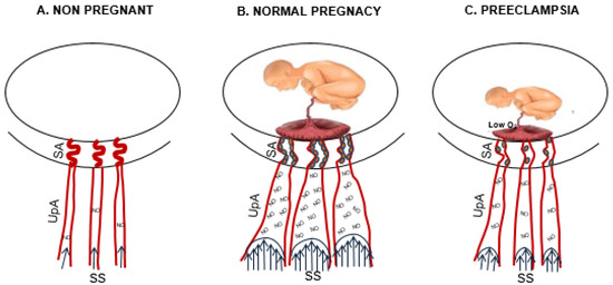 Progressive and significant blood flow increases to the uterus (and placenta) are required for suppling adequate oxygen and nutrients for fetoplacental growth and development, and for normal pregnancy outcomes. In different species, such as the ewe, rabbit, rat, mouse, guinea pig, and humans, measurements of uteroplacental blood flow (UPBF) consistently show many-fold increases occurring during pregnancy. In women, UPBF increases from 20–50 mL/min in the nonpregnant state up to 450–800 mL/min by late gestation [1]. Insufficient UPBF to the gravid uterus is associated with pregnancy complications such as preterm delivery, intrauterine growth restriction (IUGR) and preeclampsia (PE) [2,3]. The latter is a worldwide disease that affects 3–8% of pregnant women, and is characterized by hypertension, proteinuria, and edema, which may cause fetal growth restrictions and health complications in later life for both mother and infant [4]. The well-recognized clinical complications of PE underlie the pivotal importance of a proper rise of UPBF during pregnancy.