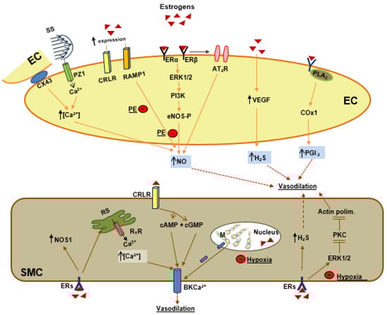 In EC (from left to right in Figure 2): (1) Estrogens indirectly increase shear stress (SS) which activates piezo 1 channels (PZ1) and connexin 43 protein (CX43) and increases intracellular calcium (Ca++) and NO production. (2) Estrogens upregulate the receptors for adrenomedullin, RAMP1, and receptors for calcitonin gene-related peptide, CRLR, the former contributing to NO production. Estrogen by its receptors, ERα and ERβ, activates the ERK1/2-PI3K -eNOS phosphorylation (eNOS-P) pathway and increases NO production. (3) Estrogens by ERβ activate angiotensin II receptors (AT2R), which contributes to NO production; (4) Estrogens by upregulation of vascular endothelial growth factor (VEGF) induce hydrogen sulfide (H2S) production; (5) Estrogens activate the phospholipase A2 (PLA2)–cyclooxygenase 1 pathway to produce prostacyclin (PGI2). Preeclampsia (PE) inhibits the estrogens, RAMP1-NO and also ERs-ERK1/2-PI3K and eNOS-P-NO.