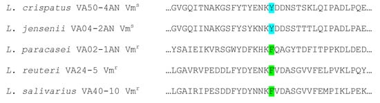 - Štšepetova, J.; Taelma, H.; Smidt, I.; Hutt, P.; Lapp, E.; Aotäht, E.; Mändar, R. Assessment of phenotypic and genotypic antibiotic susceptibility of vaginal Lactobacillus sp. J. Appl. Microbiol. 2017, 123, 524–534. [Google Scholar] [CrossRef] [PubMed]