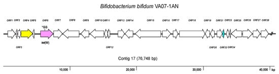 - Duranti, S.; Lugli, G.A.; Mancabelli, L.; Turroni, F.; Milani, C.; Mangifesta, M.; Ferrario, C.; Anzalone, R.; Viappiani, A.; van Sinderen, D.; et al. Prevalence of antibiotic resistance genes among human gut-derived bifidobacteria. Appl. Environ. Microbiol. 2017, 83, e02894-16. [Google Scholar] [CrossRef]