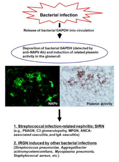 Collectively, GAPDH from various bacteria appear to react with the anti-NAPlr antibody and to have plasmin-binding ability, and positivity of the anti-NAPlr antibody and plasmin activity in glomeruli may act as both diagnostic and pathogenetic biomarkers of bacterial IRGN in general. Putative pathogenic mechanisms of IRGN, focusing on NAPlr and plasmin activity as biomarkers, are depicted in Figure 2.