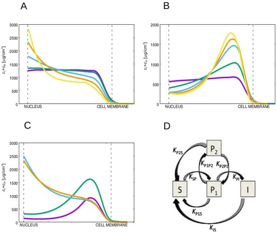More complex models could have been constructed, more specifically by distinguishing different types of particles, or different types of keratin filaments. A reasonable first step in complexifying the model would be to divide the population of keratin particles in two types: the particles that can merge into fibers () and the particles that cannot (). Therefore, distinguishing these two pools of keratin particles the simulated pathway would be the one described in Figure 3D. Since there is no permanent increase in time of the concentration of keratin particles and since the particles can clearly disassemble back into the soluble phase as they move towards the cell nucleus, in Figure 3D we need to include reactions transforming both keratin particle types into soluble keratin. Importantly, this system would have three more reactions than the one in Figure 1C and five more reactions than the model introduced in []. In this more complex system, a reasonable choice to regulate the cell mutation would be to increase the reaction rate from keratin particles to keratin particles (by increasing , for example). This increase would lead to the accumulation of keratins in the form P2. In the model of Figure 1C we consider just one keratin particle phase with a concentration of particles that corresponds to the sum of all types of keratin particles. Therefore, this concentration would be the sum of the concentrations of the two pools of keratin of the more complex model, i.e., . In this complex model the particles can disassemble by two processes with rates and . Therefore, if , the total rate of particle disassembly rate would be