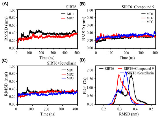The overall root mean square deviation (RMSD) of SIRT6 with and without the inhibitors. (A) SIRT6 system, (B) SIRT6+Compound 9 system and (C) SIRT6+Scutellarin system. (D) The probability distribution function of the RMSD of SIRT6 in the SIRT6 system (black), SIRT6+Compound 9 system (red) and SIRT6+Scutellarin system (blue).