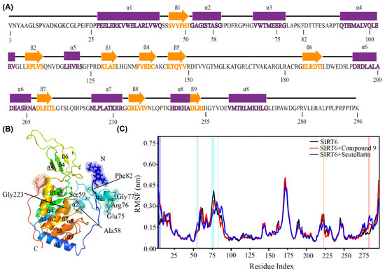 Therefore, the initial state of the protein in complex with SIRT6 is the same as in the SIRT6+Compound 9 system. Scutellarin was placed at a similar site to that of Compound 9, as shown in Figure S1E. The SIRT6+Scutellarin system is shown in the same representation as that of the SIRT6+Compound 9 system. The docking of the ligand Scutellarin with SIRT6 was similar to Compound 9 in the SIRT6+Compound 9 system.