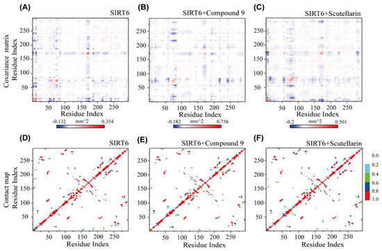 The effect of inhibitors on the interactions between the residues of SIRT6. Covariance matrix and residue–residue contact probability maps for SIRT6, respectively, in the SIRT6 system (A,D); in the SIRT6+Compound 9 system (B,E); and in the SIRT6+Scutellarin system (C,F).