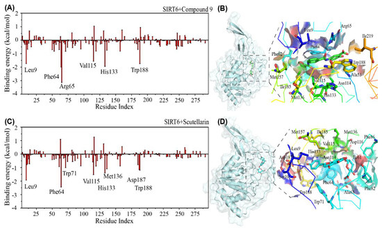 Identification of the binding sites of SIRT6 by calculating the binding energies. After investigating the convergence of the research systems and the influence of the inhibitors on the conformation of SIRT6, we examined the binding free energy of the inhibitors bound to the protein SIRT6 using the MM/PBSA method. Interestingly, we found that the overall values are −25.66 kcal/mol (Compound 9) and −23.65 kcal/mol) (Scutellarin), respectively. The structurally similar inhibitors have the close bound energy with SIRT6. To understand the underlying interactive mechanism between the protein and the inhibitors, the first step is to identify the most favourable residues. To solve this problem, we first calculated the binding free energy of the inhibitors with each amino acid residue of SIRT6 by discarding the first 100 ns of the three MD trajectories with the MM/PBSA method. Figure 4A shows that Compound 9 has a preference for the long hydrophobic channel (residues: Leu9, Phe64, Arg65, Val115, His133 and Trp188). Interestingly, we found that the binding site of Scutellarin to SIRT6 (residues: Leu9, Asp63, Phe64, Trp71, Val115, Asp116, His133, Met136, Asp187 and Trp188) is very similar to the binding site of Compound 9. The experiments also reported the residues: Leu9, Phe82, Phe86 Val153 and Met157 are the binding sites located at the surface in the long SIRT6 channel pocket (shown in Figure S5) [43]. To provide an instructive view of the binding position distribution of the small molecules on the surface of SIRT6, we present the binding residues of SIRT6 around the small molecules in Figure 4B,D, Figures S6 and S7. From the snapshot, we can see that the small molecule Compound 9 and Scutellarin insert into the long channel pocket. It has been reported that the binding pocket is between the small domain and the larger Rossmann-fold domain [24].
