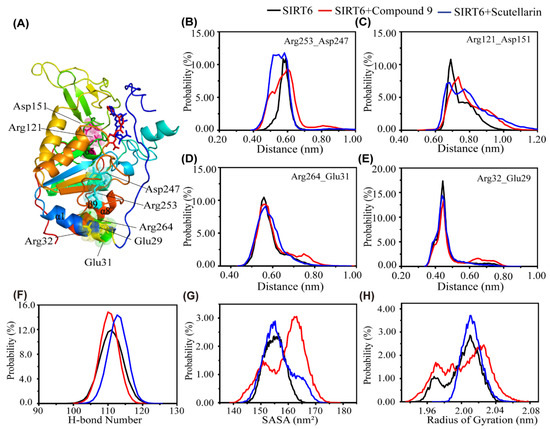 The influence of the inhibitors on the salt bridge and conformational properties of SIRT6. (A) Representative conformational snapshot of SIRT6. The SIRT6 protein is shown in cartoon style with the involved residues shown in surface representation and the inhibitors shown as sticks using PyMOL. The distance between Arg253 and Asp247 (B), Arg121 and Asp151 (C), Arg264 and Glu31 (D), Arg32 and Glu29 (E) in the SIRT6 (black), SIRT6+Compound 9 (red) and SIRT6+Scutellarin (blue) systems. (F) The probability distribution function for the number of H–bonds in SIRT6. (G) The probability distribution function of the SASA in SIRT6. (H)The probability distribution function of the radius of gyration in the SIRT6 system (black line), SIRT6+Compound 9 system (red line) and SIRT6+Scutellarin system (blue line).
