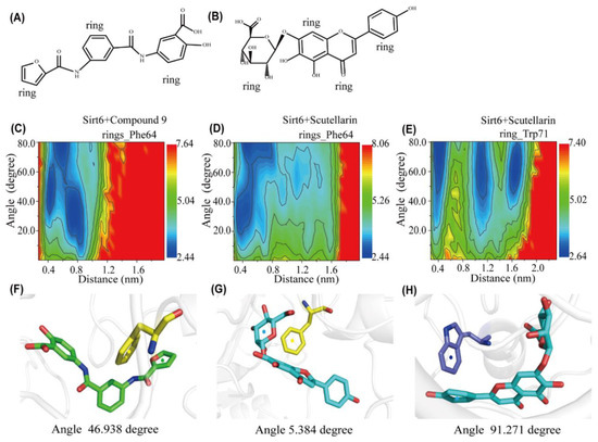 Analysis of aromatic stacking interactions between the rings of the inhibitors and aromatic residues. The chemical structures of Compound 9 (A) and Scutellarin (B). The free energy landscape as a function of the centroid distance and the angle between the rings of the inhibitors and the rings of aromatic residues of SIRT6 for the SIRT6+Compound 9 system (C,F) and SIRT6+Scutellarin system (D,E,G,H). Representative snapshots using PyMOL showing a herringbone–aligned stacking orientation between the aromatic ring of Phe64 and the ring of Compound 9 (F) in the SIRT6+Compound 9 system, a parallel–aligned aromatic stacking orientation between the aromatic ring of Phe64 and the rings of Scutellarin (G) in the SIRT6+Scutellarin system and a perpendicular–aligned stacking orientation between the aromatic ring of Trp71 and the ring of Scutellarin in the SIRT6+Scutellarin system (H).