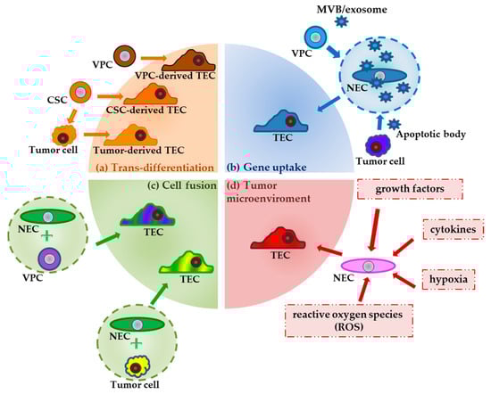 There are several mechanisms causing cytogenetic abnormalities in TECs. Vascular progenitor cells (VPCs) and tumor cells, previously formed from cancer stem cells, can directly transdifferentiate into specific TECs or fuse with NECs and then transform into TECs (Figure 1). Endothelial progenitor cells (EPCs) or tumor cells can release exosomes and apoptotic bodies to allow ECs to take up human tumor oncogenes by phagocytosis. Hypoxia, reactive oxygen species (ROS), growth factors or cytokines released in the tumor microenvironment may be another factor causing genetic instability [].