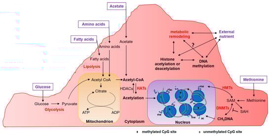 Metabolic reprogramming of EC derived from the intrinsic and extrinsic microenvironment. Acetyl-CoA derived from glucose, fatty acid, amino acid or acetate metabolism is the substrate for histone acetylation driven by HATs. Metabolic remodeling can upregulate enzymatic activity from glycolysis, lipolysis and other pathways leading to overproduction of acetyl-CoA in the cytoplasm. DNA methylation is governed by the availability of dietary methionine, that enters a cycle due to its conversion into SAM, a donor of the methyl groups. DNMTs—DNA N-methyltransferase; HATs—histone Acetyl-Transferase; HDACs—histone deacetylase; HMTs—histone methyltransferases; SAM—S-adenosyl-methionine; SAH—S-adenosyl-homocysteine.