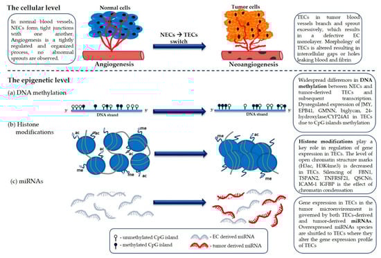 Here, we reviewed the cellular and molecular differences between NECs and TECs that originate from the respective microenvironments including acellular exchange by nutrient or miRNAs and paracrine communication. As discussed in this review, we established that the differences between the two ECs pools heavily rely on epigenetic alterations, as summarized in Figure 3. The fact that TECs are functionally different from NECs provides a therapeutic opportunity to target the tumor vasculature and clinical trials targeting simultaneously tumor cells, as well as the tumor vasculature, are underway. While still in its infancy, the field of investigation on TECs, and on the epigenetic determinant leading to the specificity of TECs versus NECs, provides a promising avenue to target vascularized tumors.