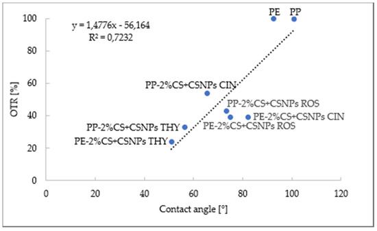 The correlation between OTR (%) and contact angle, previously analyzed in Reference [23], is given in Figure 1.